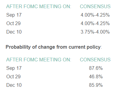 Forecasting Federal Reserve policy changes in coming months. Expecting a modest August jobs report, Fed watchers see a rate cut this month, but a hold in October before another cut in December. Note: In the lower chart, the 87.6% probability of change means there’s only a 12.4% probability the rate will stay the same. Current rate is 4.25%-4.50%.