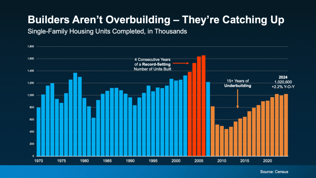And here’s some other important perspective you’re not going to get from those headlines. After the 2008 crash, builders slammed on the brakes. For 15 years, they didn’t build enough homes to keep up with demand. That long stretch of underbuilding created a major housing shortage, which we’re still dealing with today.